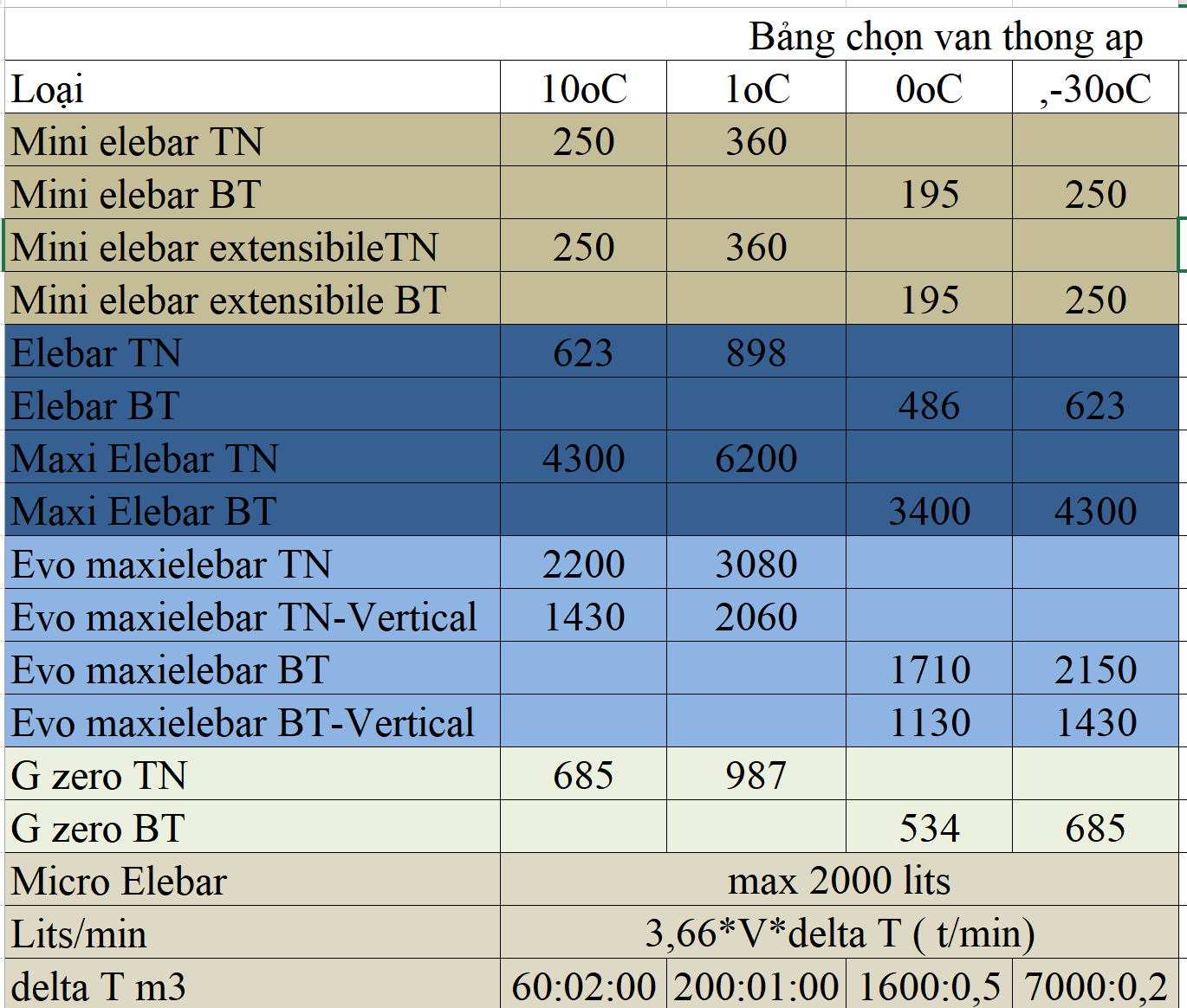 Q= 3,66 x 60 x 2 = 439 lit/min vậy ta chọn 1 van ELEBAR TN (có lưu lượng 623l/min – +10 oC và 898 l/min +1 oC)